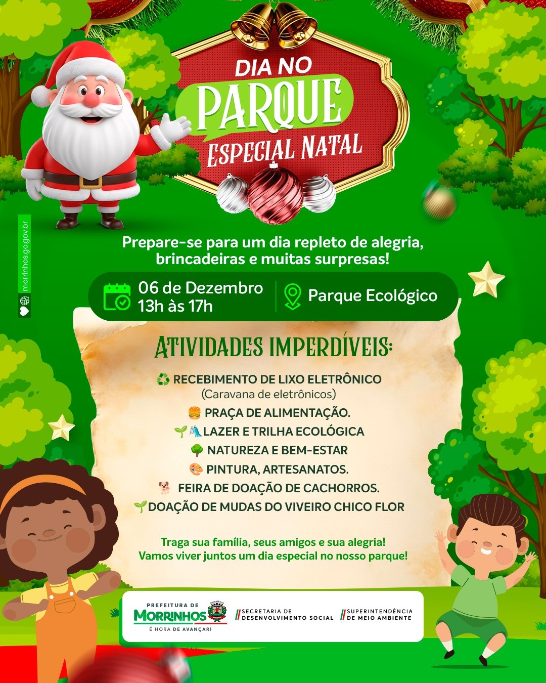 A Prefeitura de Morrinhos realiza neste sábado, 6 de dezembro, a última edição de 2025 do Dia no Parque, no Parque Ecológico Jatobá Centenário, e reforça seu compromisso com práticas ambientais responsáveis. Além da já tradicional tarde de lazer, educação ambiental e convivência em meio à natureza, o evento destaca uma importante mobilização voltada para o descarte correto de lixo eletrônico, incentivando a população a adotar hábitos sustentáveis no dia a dia.